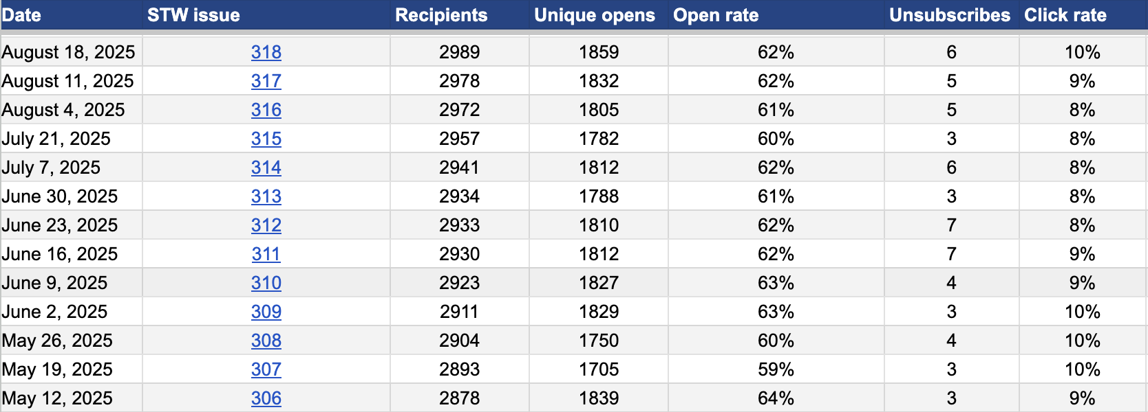 - A week after a newsletter was sent, sponsors are provided with performance statistics through a shared Google sheet.