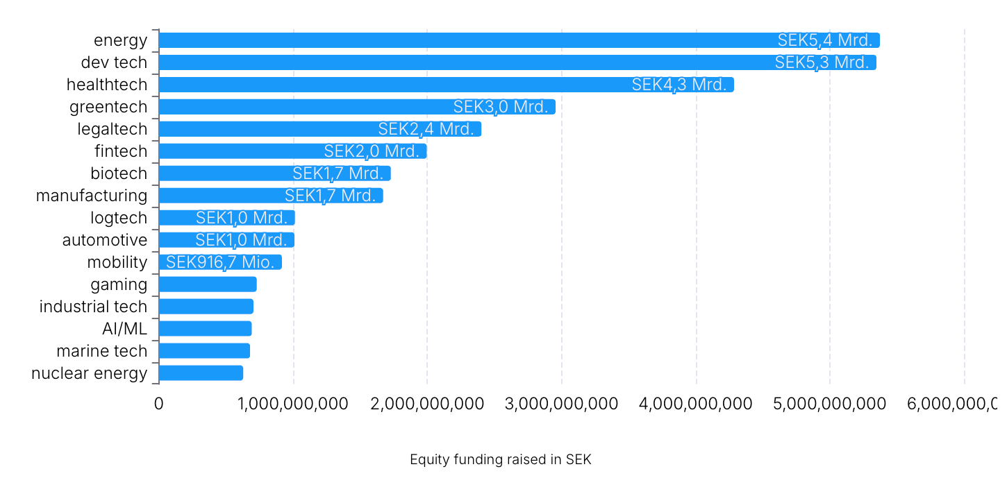 Dev tech ranks this high because of Lovable's large rounds. Healthtech hits #3 mostly due to Neko Health's $260M Series B round.